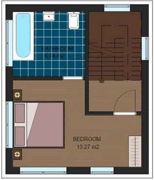 此款木屋設計為兩層樓,木屋總面積45米²;一樓一個寬敞的內部開放式結構,一樓配備客人衛(wèi)生間4.2平米,臥室12平米